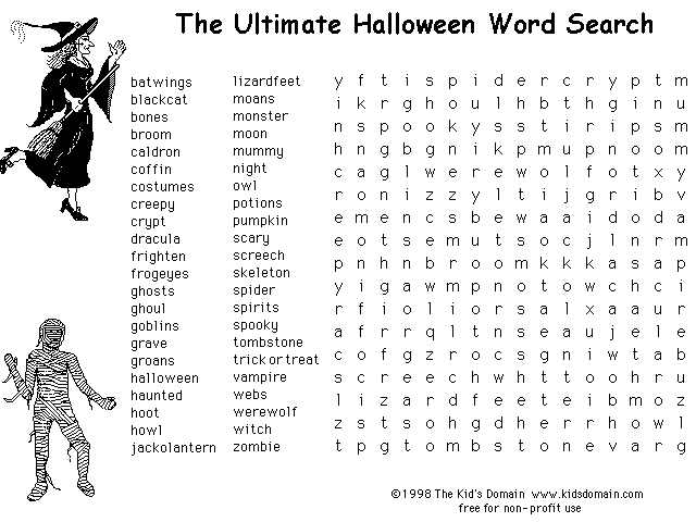 Why didn't the skeleton cross the road? He didn't have the guts. What do skeletons say before they begin dining? Bone Appetit!! What do ghosts serve for dessert? Ice Scream Why do witches fly on brooms? Vacuum cleaner cords aren't long enough. When is it bad luck to meet a black cat? When you're a mouse What was the witch's favorite subject in school? Spelling What do you call a friendly dead Egyptian? A Chummy Mummy What do you call a skeleton who won't work? Lazy Bones What do you call a fat Jack-O-Lantern? A Plumpkin Where do baby ghosts go during the day? Dayscare center Why don't skeletons like parties? They have no body to dance with. What kind of mistakes do spooks make? Boo Boos What monster flies his kite in a rain storm? Benjamin Frankenstein What do witches put on their hair? Scare Spray What was the favorite game at the ghosts' birthday party? Hide and Shriek How does a witch tell time? She looks at her witch watch. How does a monster score a football touchdown? He runs over the ghoul line. What do the birds sing on Halloween? Twick or Tweet What is Transylvania's national sport? Drac Racing Who won the skeleton beauty contest? No Body Did you hear what happened to the boy and girl vampires? They loved in vein. Which story do all little witches love to hear at bedtime? Ghoul Deluxe and the Three Scares Why wasn't there any food left after the monster party? Because everyone was a Goblin. What's the first thing ghosts do when they get in a car? They Boo- kle their seatbelts Why do mummies make good employees? They get all wrapped up in their work. What surgery does a vampire doctor perform? Fly by night operations. What did the ghost buy for his Haunted House? Home Moaners Insurance. Why are there fences around cemeteries? People are dying to get in. Who did Frankenstein take to the prom? His Ghoul Friend. What's a monster's favorite play? Romeo and Ghouliet What has webbed feet, feathers, fangs and goes quack-quack? Count Duckula |